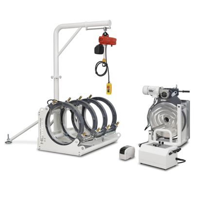 Practical plastic butt-welding machines for jointing PE and PP pipes and fittings from O.D. 32 / 40 - 160 mm (1½" ‑ 6") with the heating element process, these tremendously mobile next-generation welding machines for on-site and in-shop applications are extremely versatile and especially suited for sanitary installations, drain piping, and pressure pipes for water conveyance as well as roof drains and chimney refurbishing systems. The machines are shiped with a sturdy stand, an electrical facing tool, heating element, and all reducer inserts; arrives plug-and-play, fully installed. Its clamps swivel by up to 15 degrees allowing segmented bend welding in sizes O.D. 32 / 40 - 160 mm (1½" ‑ 6").